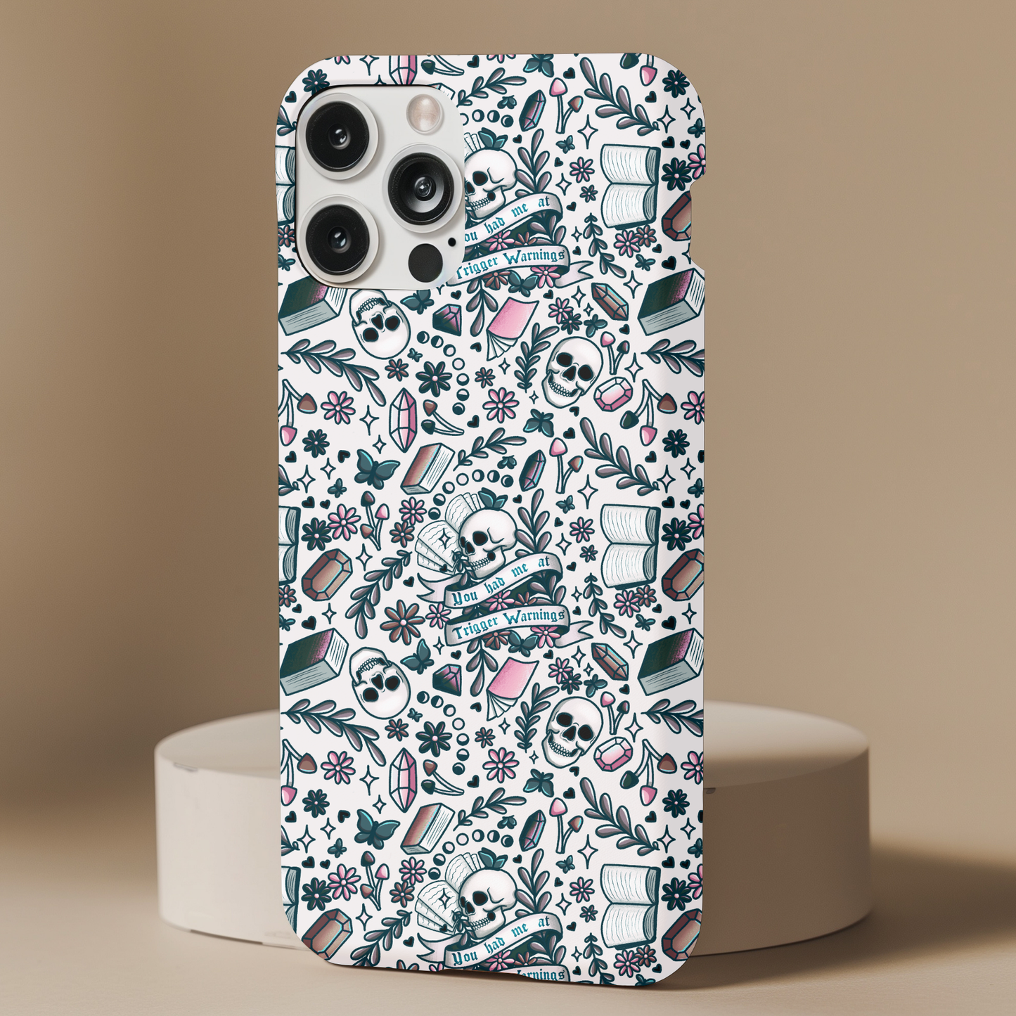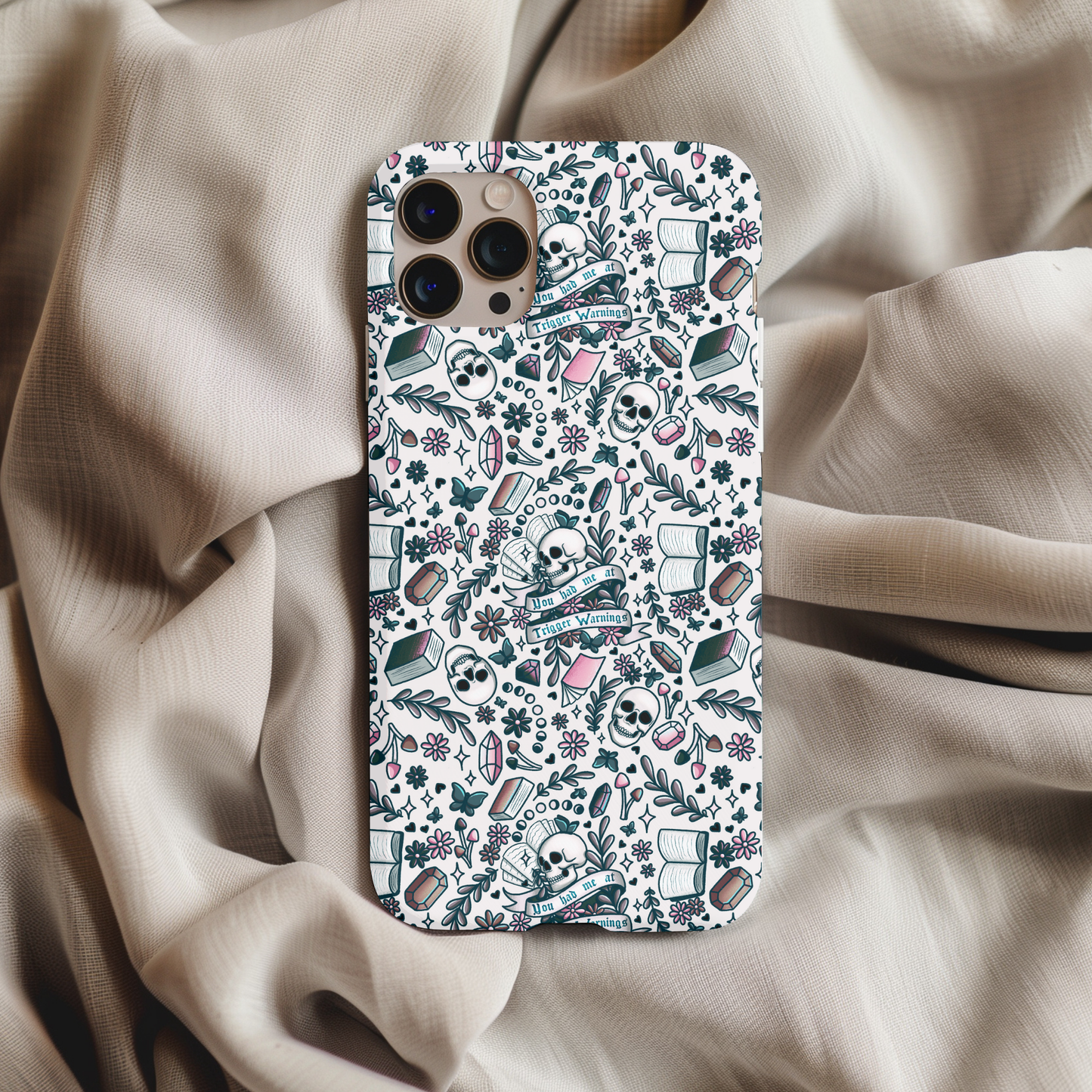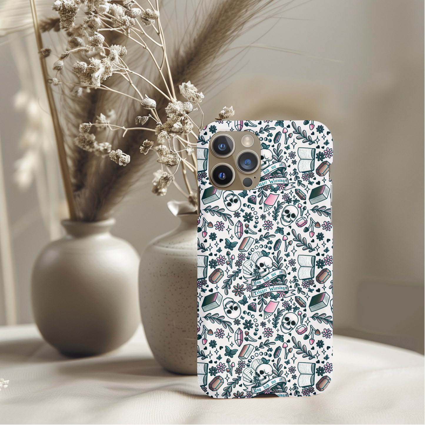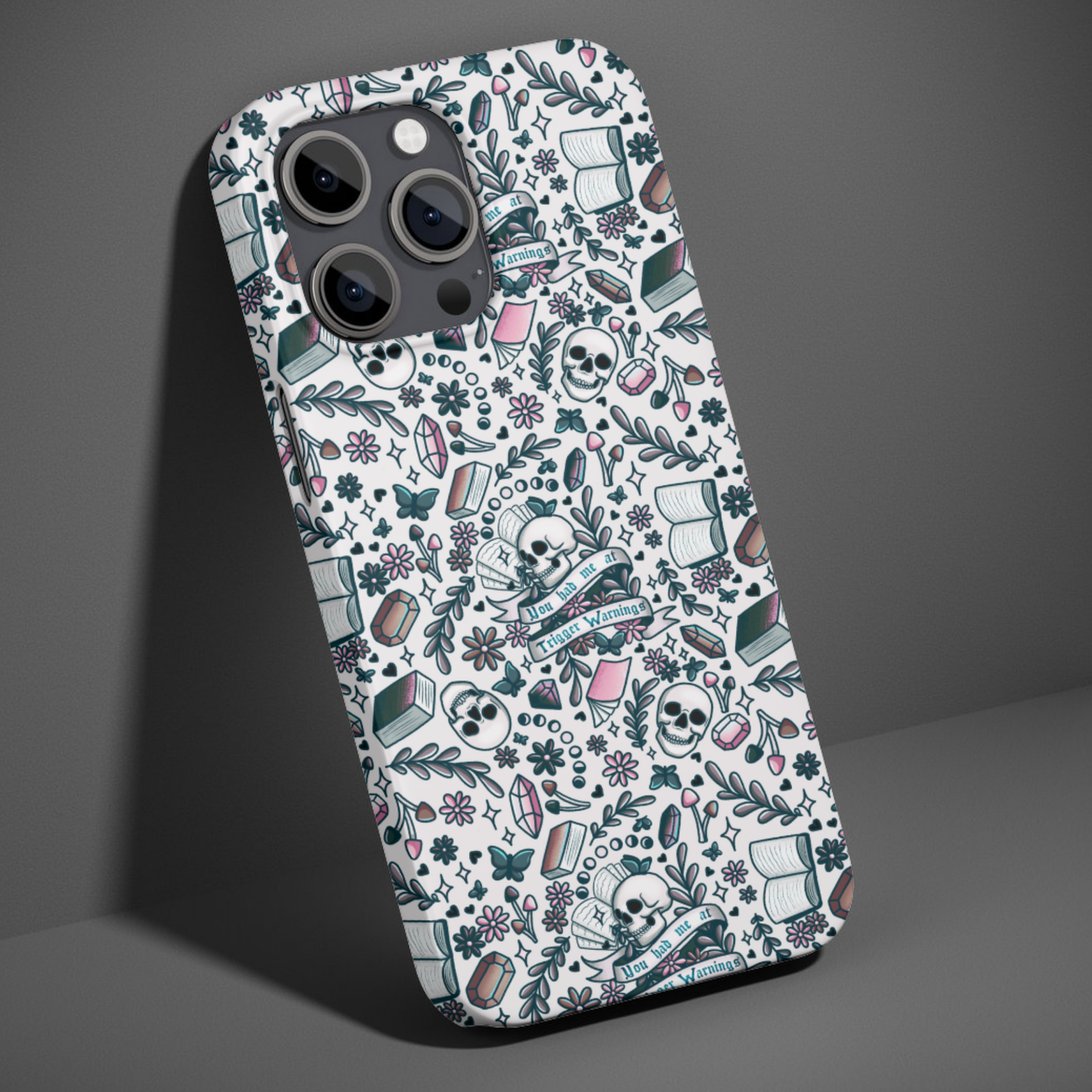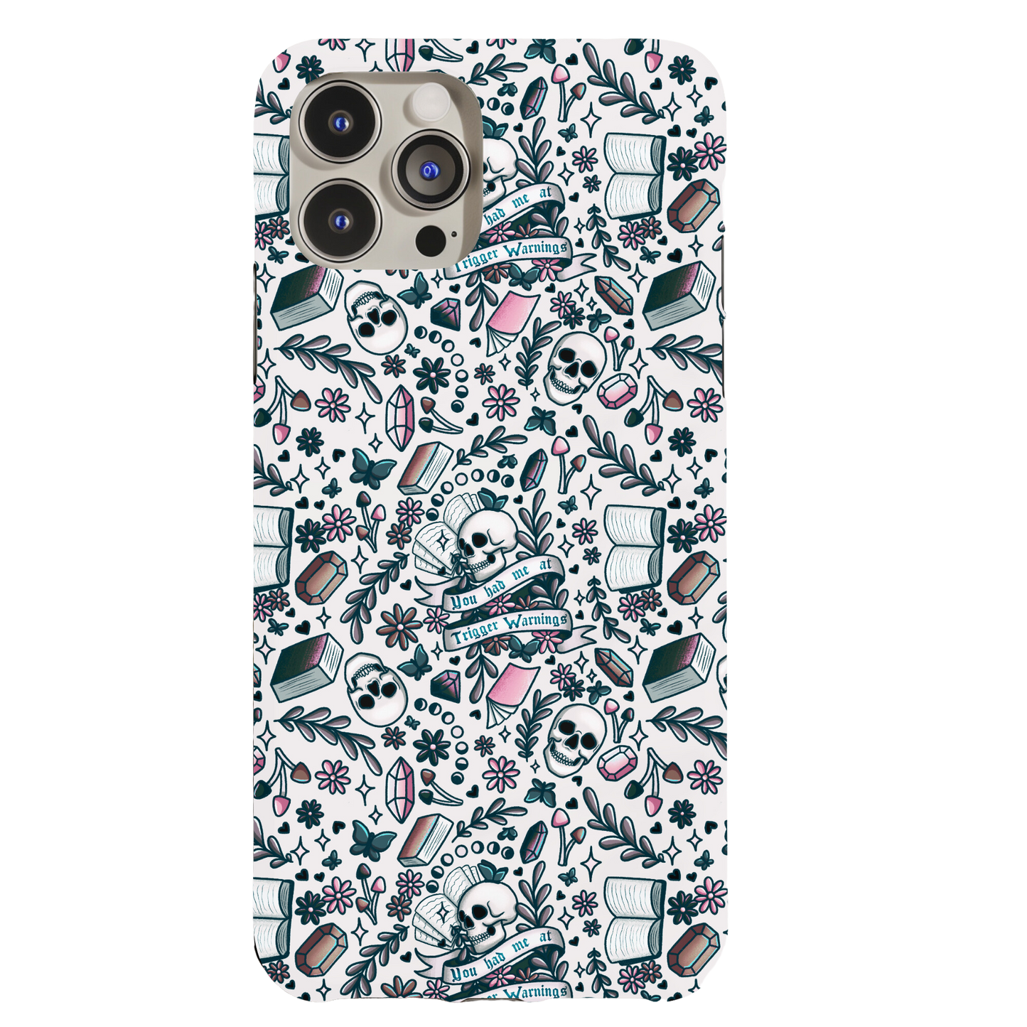 Show off your style with this Bookish Trigger Warnings Phone Case. This dual-layer tough case features a striking design that blends beauty with durability. Beneath its chic exterior lies a shock-absorbing inner core and a rugged outer shell, offering a secure grip and raised edges to protect your screen and camera through every adventure.