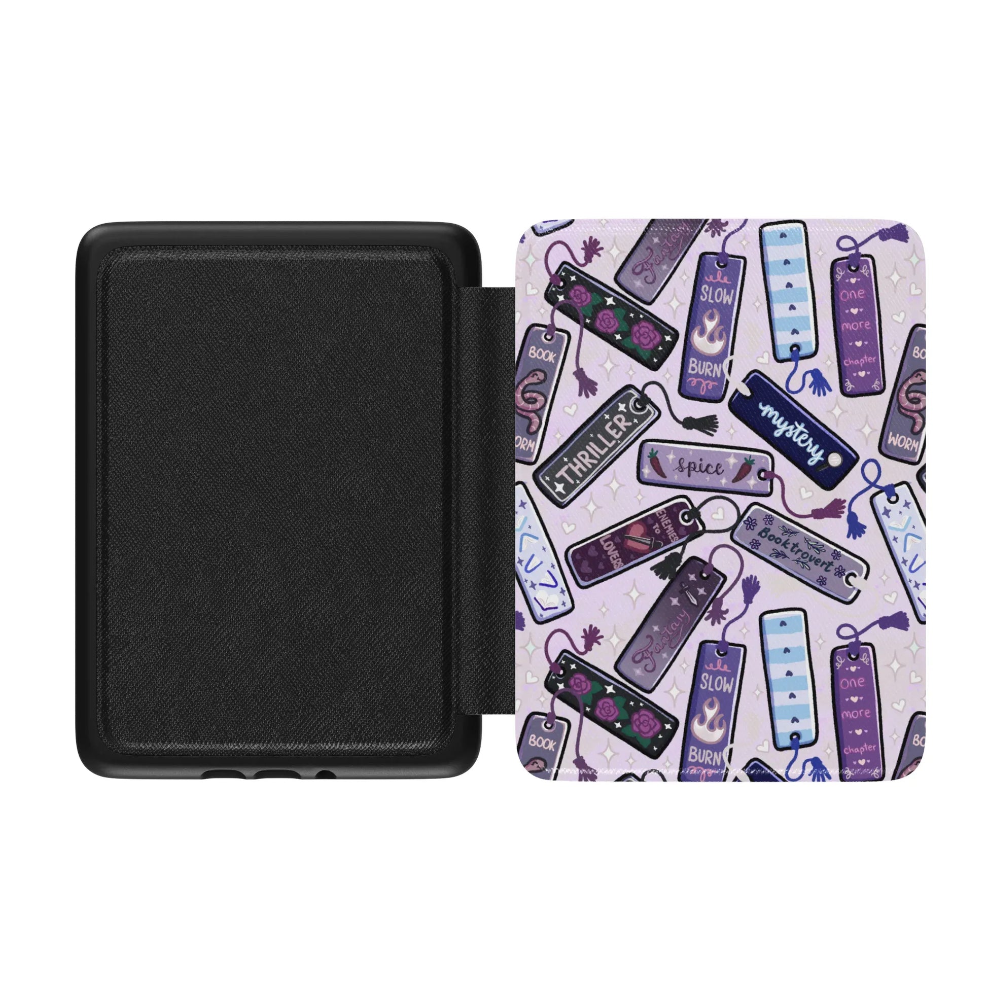 Bookish Tropes Bookmarks Leather Kindle Case for 2024 Kindle Paperwhite® 7" (12th Gen) & Signature Models. Crafted with a satin-finish Saffiano leatherette front, this durable, lightweight case features a secure strap, auto wake/sleep function, and sleek black spine. Stylish protection with a high-end look—perfect for daily use.