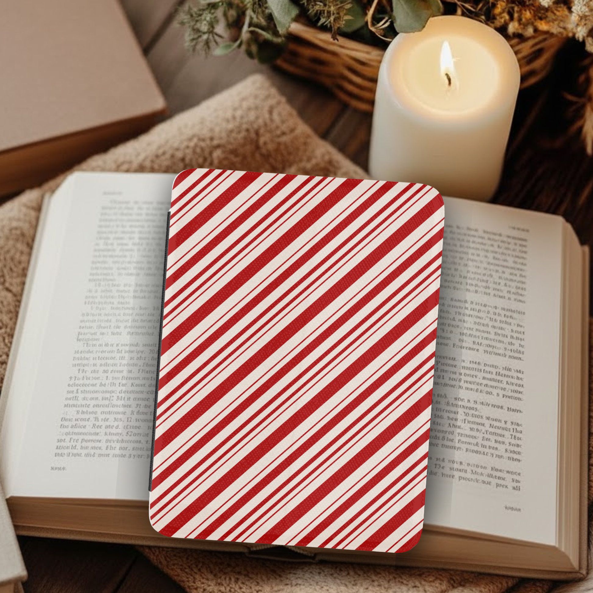 Candy Cane Kindle Case for 2024 Kindle Paperwhite® 7" (12th Gen) & Signature Models. Crafted with a satin-finish Saffiano leatherette front, this durable, lightweight case features a secure strap, auto wake/sleep function, and sleek black spine. Stylish protection with a high-end look—perfect for daily use.