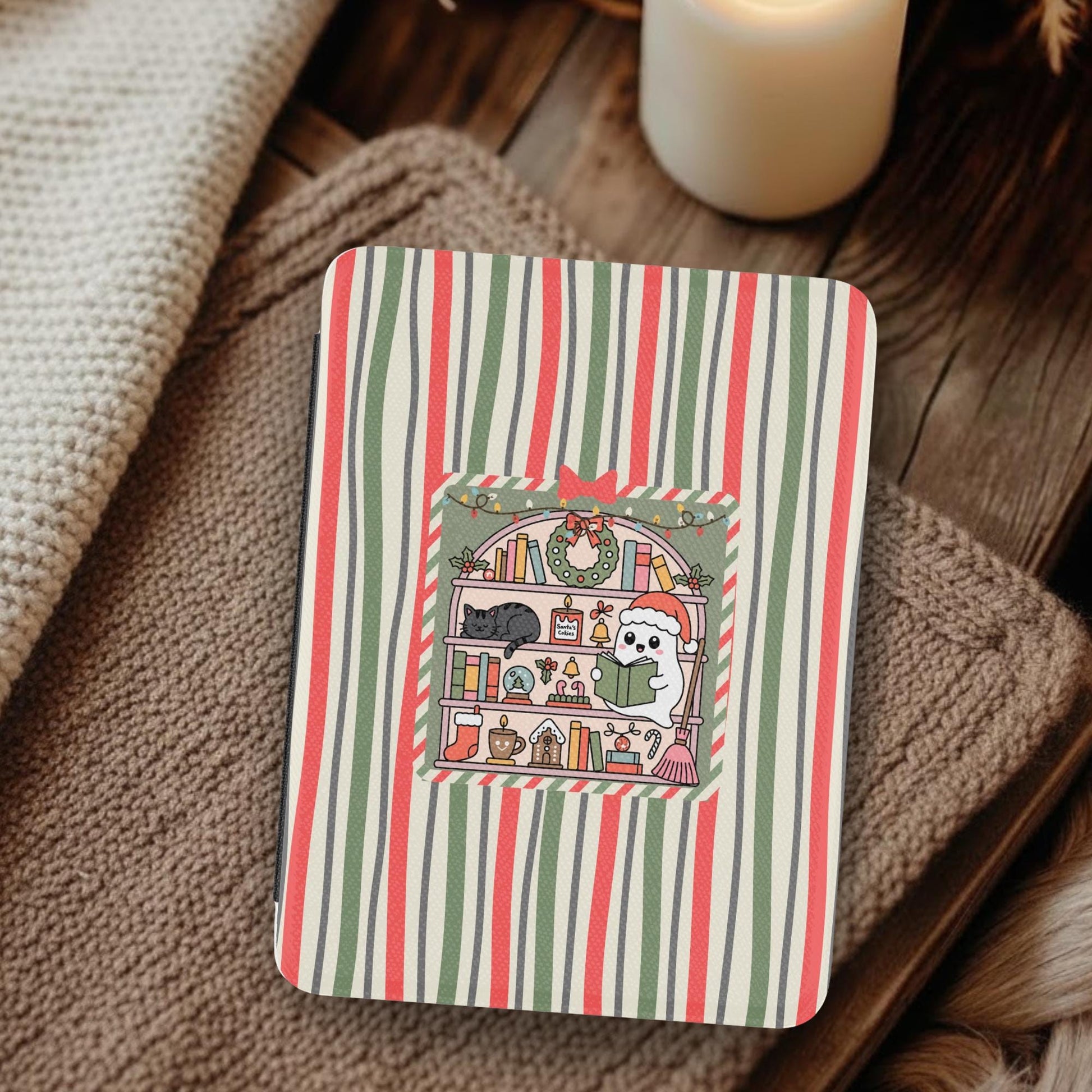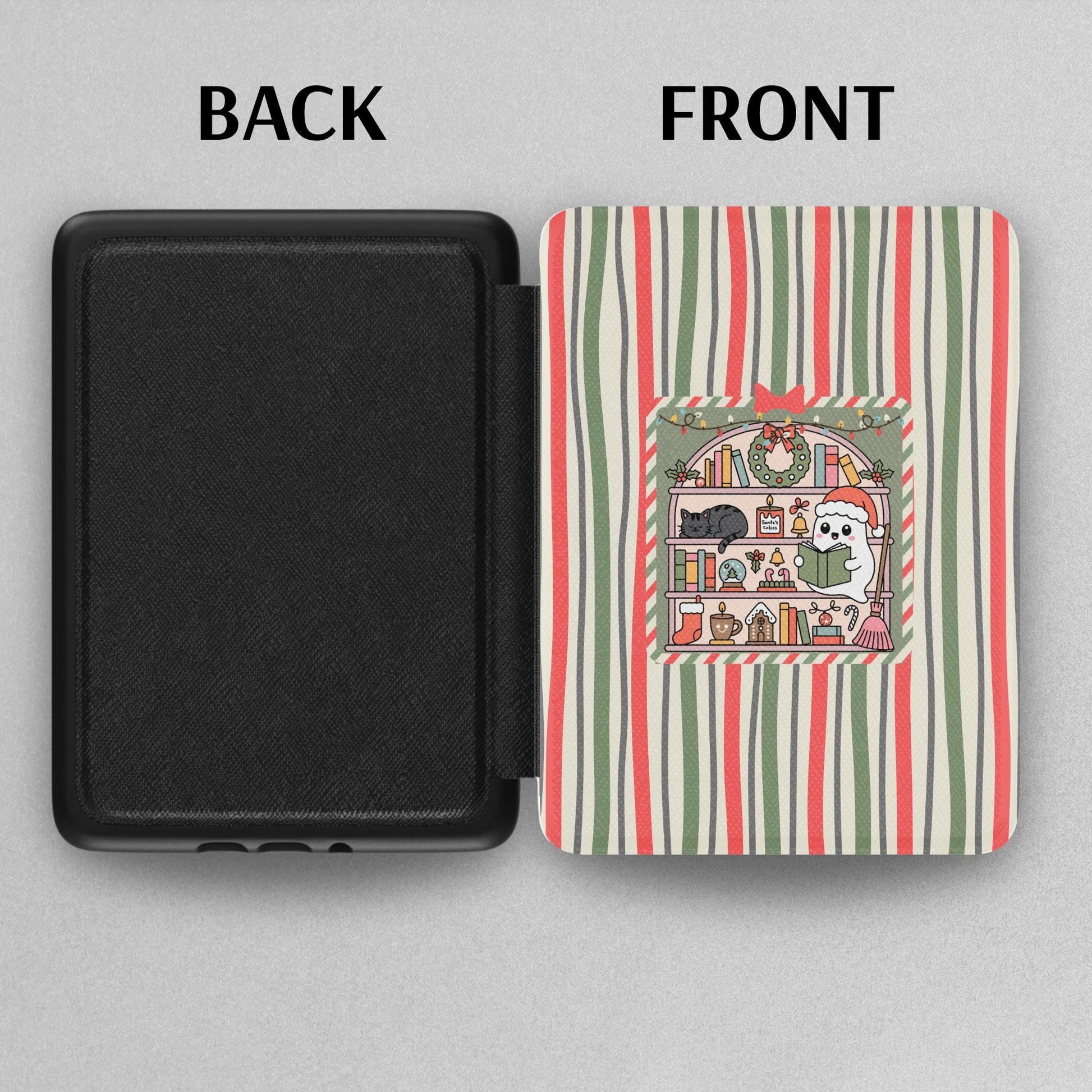 Christmas Stripe Ghost Bookish Kindle Case for 2024 Kindle Paperwhite® 7" (12th Gen) & Signature Models. Crafted with a satin-finish Saffiano leatherette front, this durable, lightweight case features a secure strap, auto wake/sleep function, and sleek black spine. Stylish protection with a high-end look—perfect for daily use.