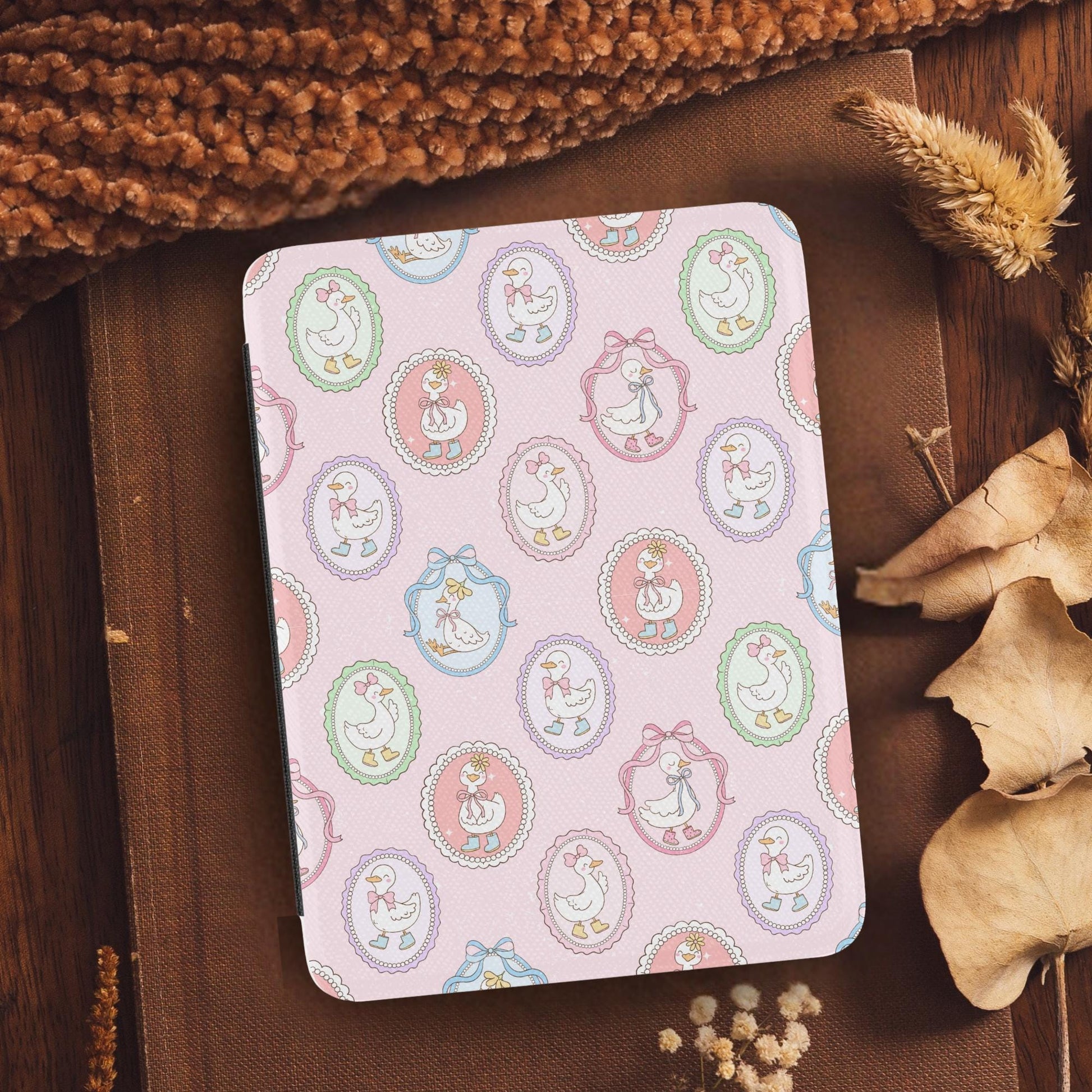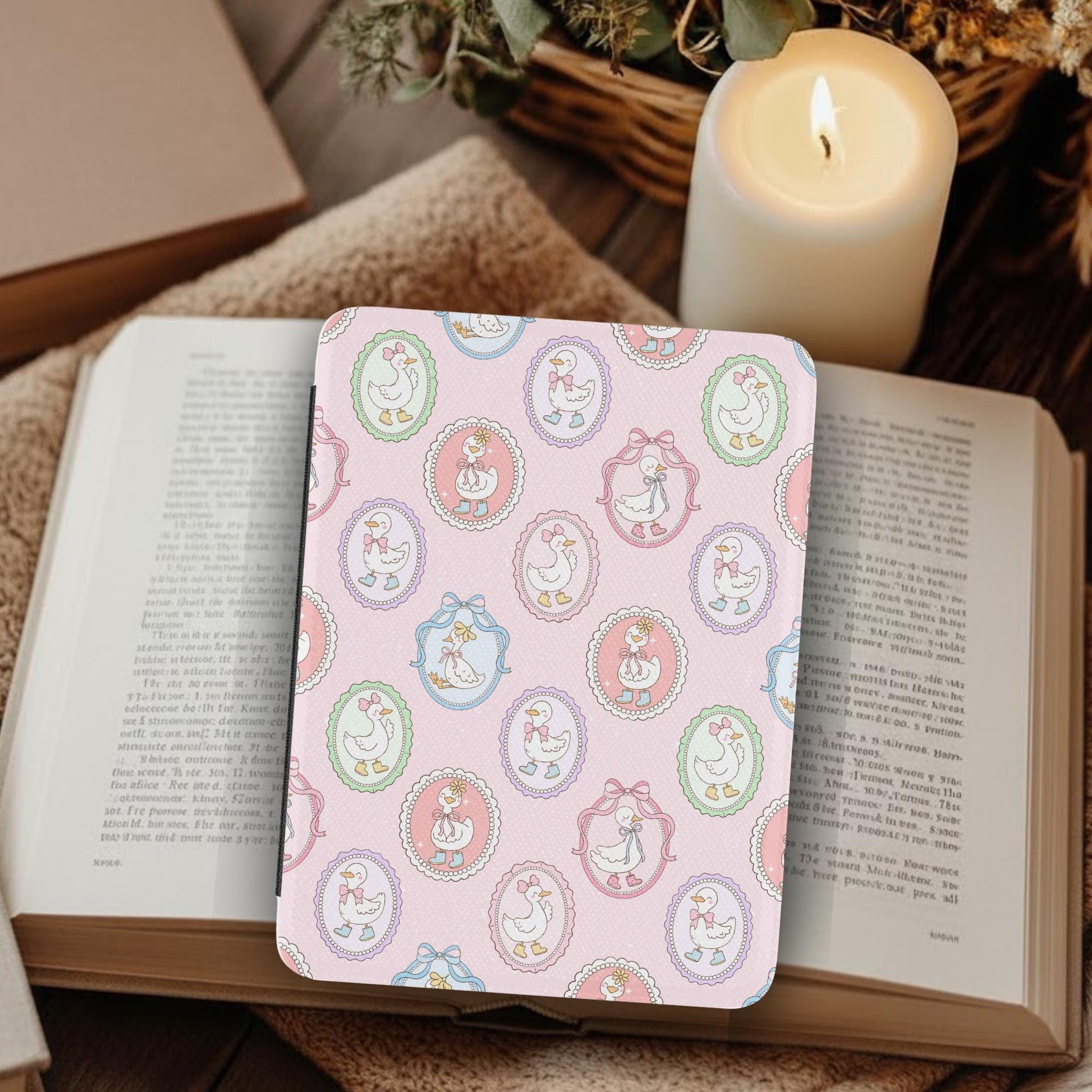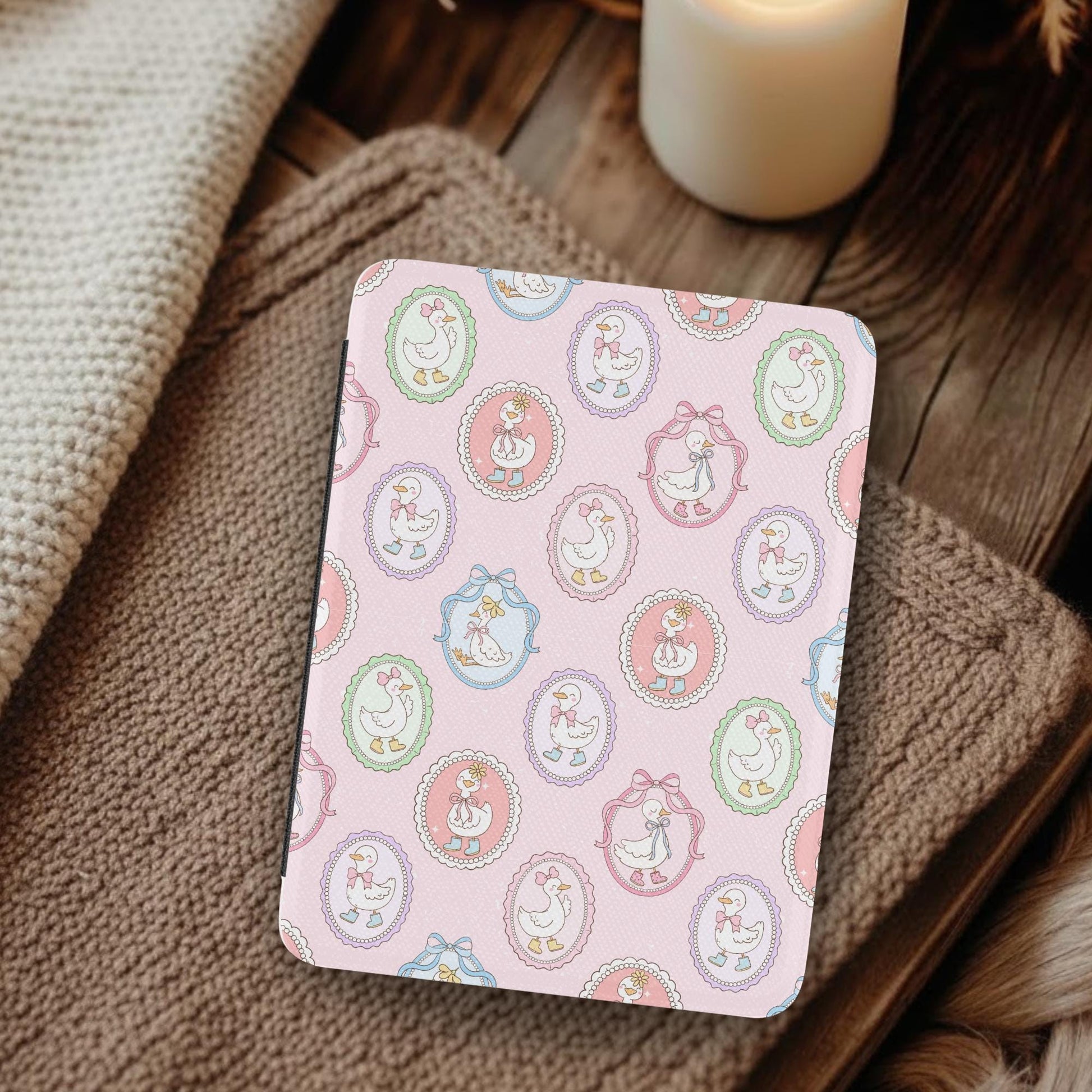 Coquette Goose Frames Kindle Case for 2024 Kindle Paperwhite® 7" (12th Gen) & Signature Models. Crafted with a satin-finish Saffiano leatherette front, this durable, lightweight case features a secure strap, auto wake/sleep function, and sleek black spine. Stylish protection with a high-end look—perfect for daily use.