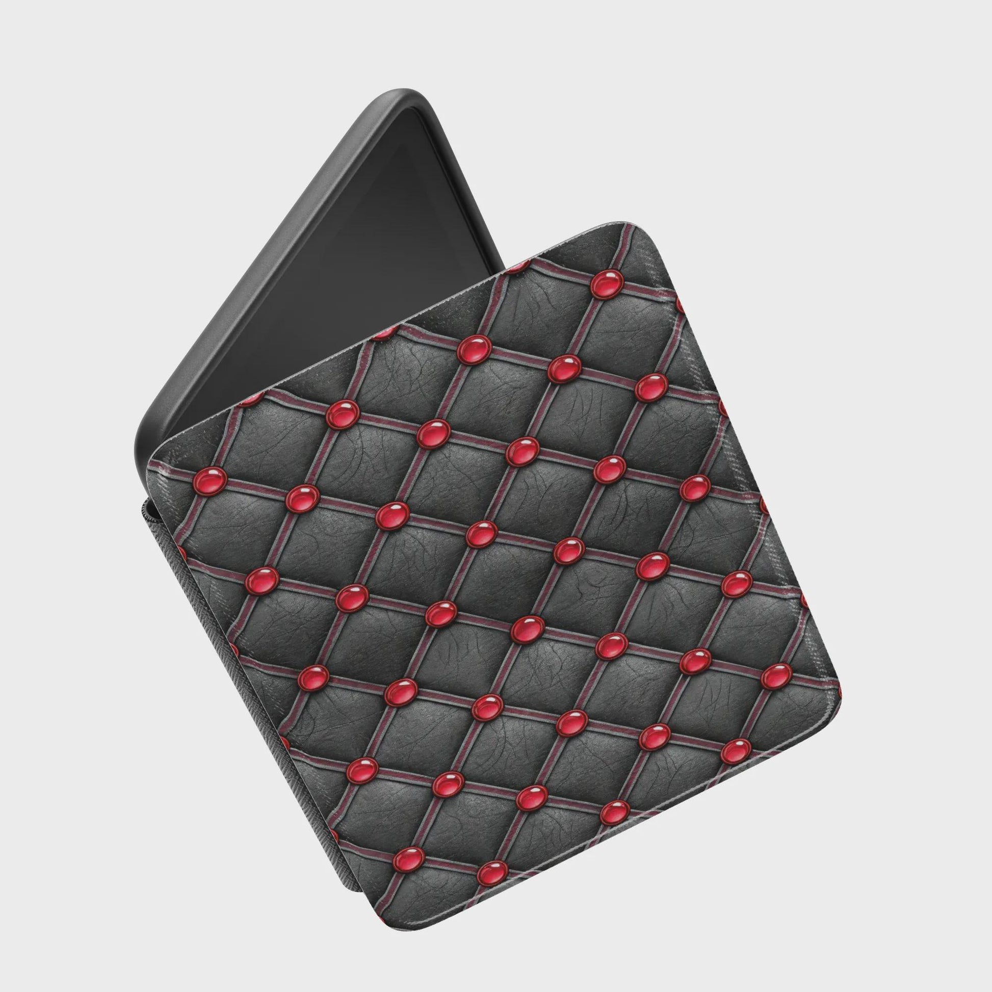 Gothic Black Vampire Kindle Case for 2024 Kindle Paperwhite® 7" (12th Gen) & Signature Models. Crafted with a satin-finish Saffiano leatherette front, this durable, lightweight case features a secure strap, auto wake/sleep function, and sleek black spine. Stylish protection with a high-end look—perfect for daily use.