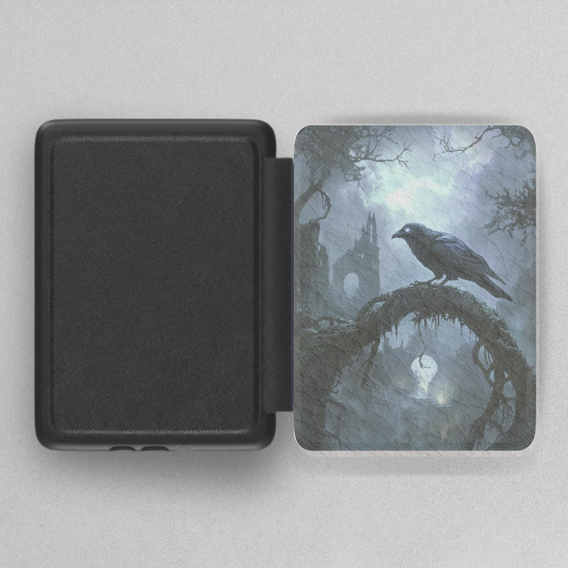 Gothic Spooky Raven Kindle Case for 2024 Kindle Paperwhite® 7" (12th Gen) & Signature Models. Crafted with a satin-finish Saffiano leatherette front, this durable, lightweight case features a secure strap, auto wake/sleep function, and sleek black spine. Stylish protection with a high-end look—perfect for daily use.