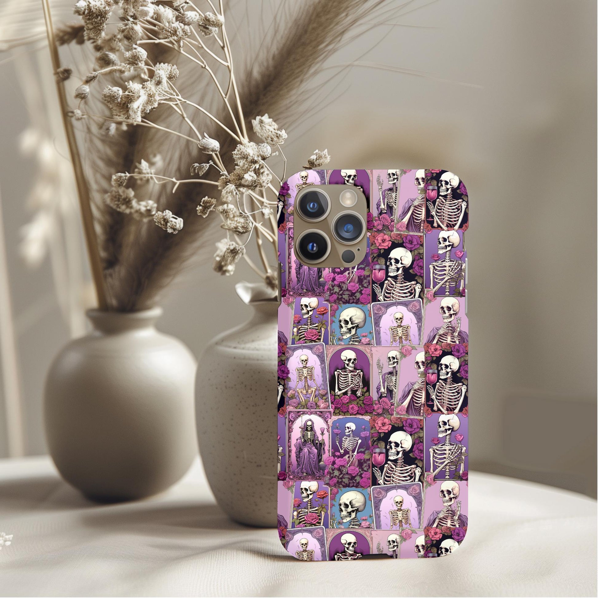 Show off your style with this Halloween Skeleton Tarot Cards Phone Case. This dual-layer tough case features a striking design that blends beauty with durability. Beneath its chic exterior lies a shock-absorbing inner core and a rugged outer shell, offering a secure grip and raised edges to protect your screen and camera through every adventure.