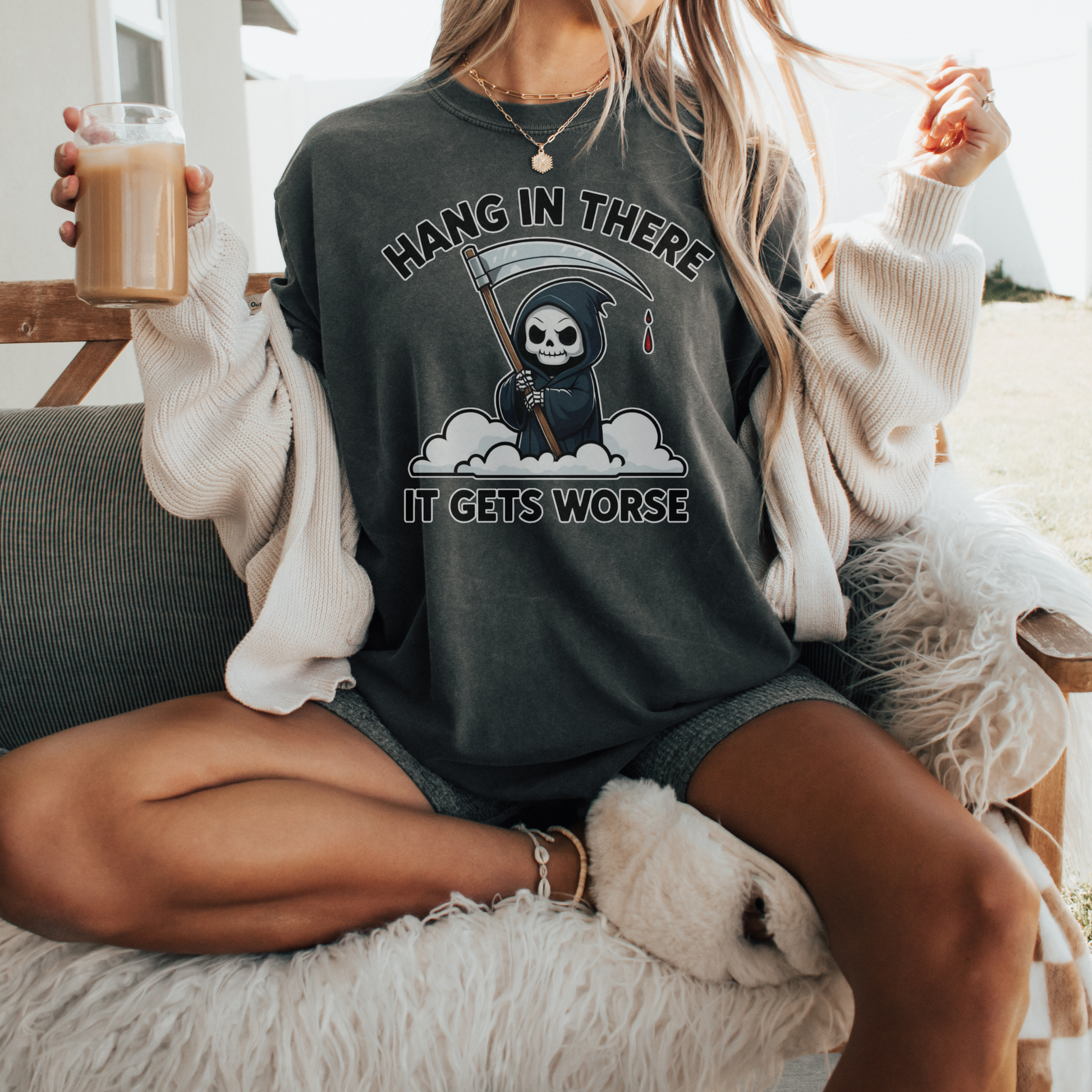 Cozy up in style with our Comfort Colors® collection! Featuring ultra-soft, garment-dyed fabric, these shirts, long sleeves, and sweatshirts featuring a Hang In There It Gets Worse Grim Reaper design offer a relaxed fit and vintage look for all-day comfort. Perfect for everyday wear with a lived-in feel you’ll love!
