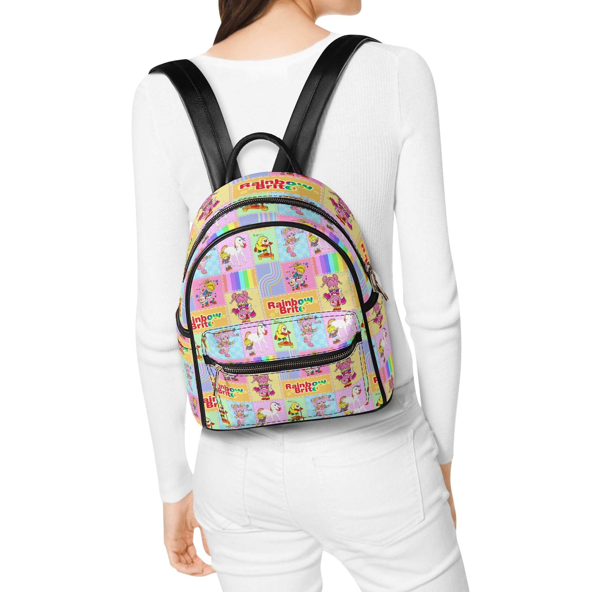 Enhance your style with this durable Rainbow Brite Mini Leather Backpack. It features a spacious main compartment, side zipper pockets, a metal-zippered garment pocket, and an easy-access front pocket. Adjustable straps ensure all-day comfort—perfect for work, travel, or casual outings!