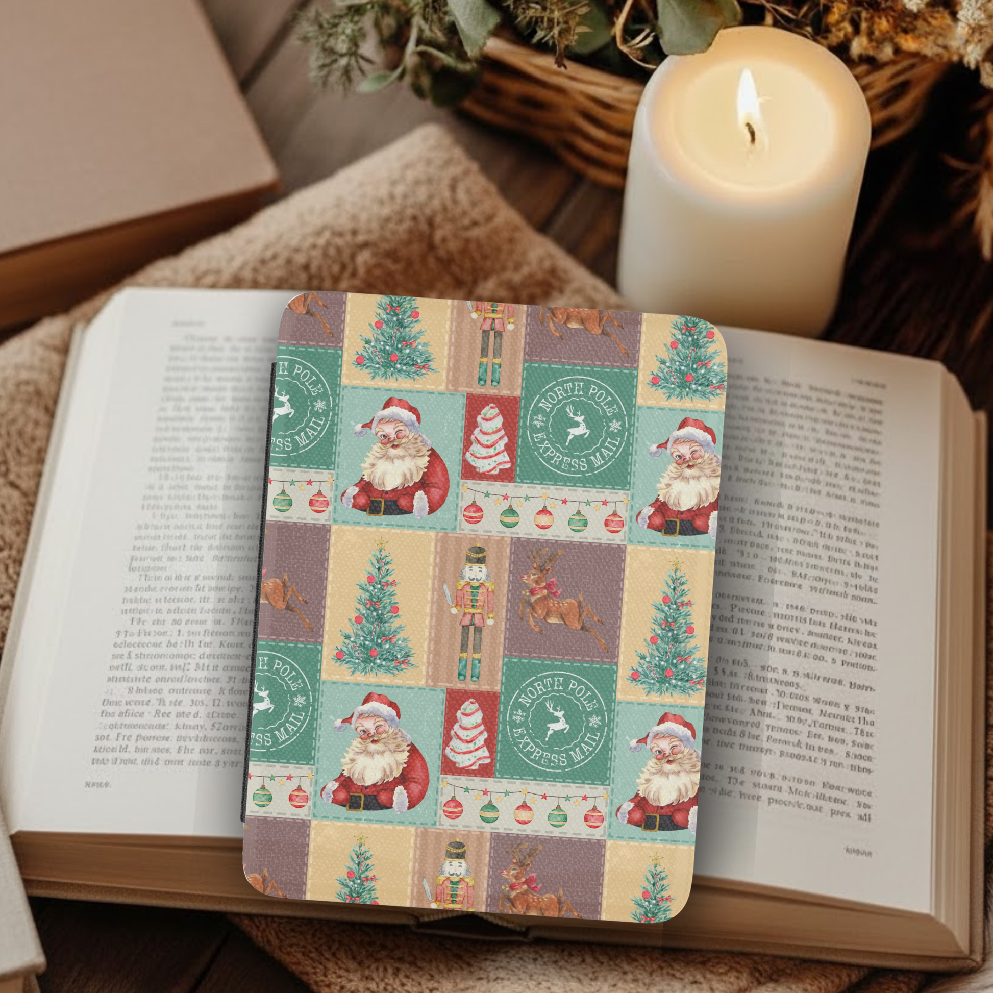 Vintage Christmas Patchwork Kindle Case for 2024 Kindle Paperwhite® 7" (12th Gen) & Signature Models. Crafted with a satin-finish Saffiano leatherette front, this durable, lightweight case features a secure strap, auto wake/sleep function, and sleek black spine. Stylish protection with a high-end look—perfect for daily use.